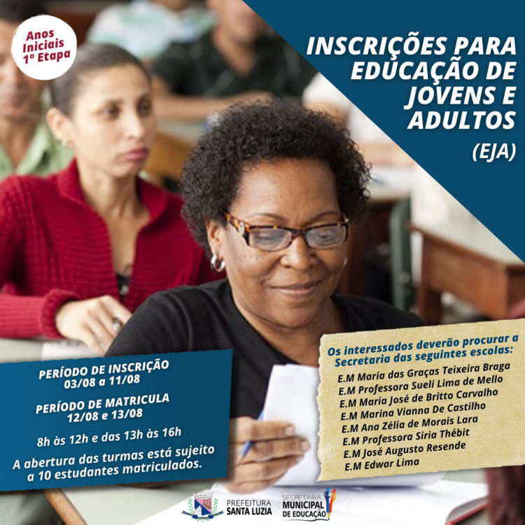 Estão abertas as inscrições para a Educação de Jovens e Adultos (EJA) para os Anos iniciais (1ª etapa)