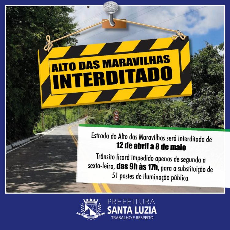 A partir de segunda-feira, dia 12 de abril, por medida de segurança, a Estrada Alto das Maravilhas ficará interditada para realocação / substituição de 51 postes de telefonia. O serviço será realizado pela empresa Telemont e segue até o dia 8 de maio. O trânsito na via ficará suspenso apenas de segunda à sexta-feira, das 9h às 17h. Fora do referido horário e aos finais de semana, o trânsito estará liberado.