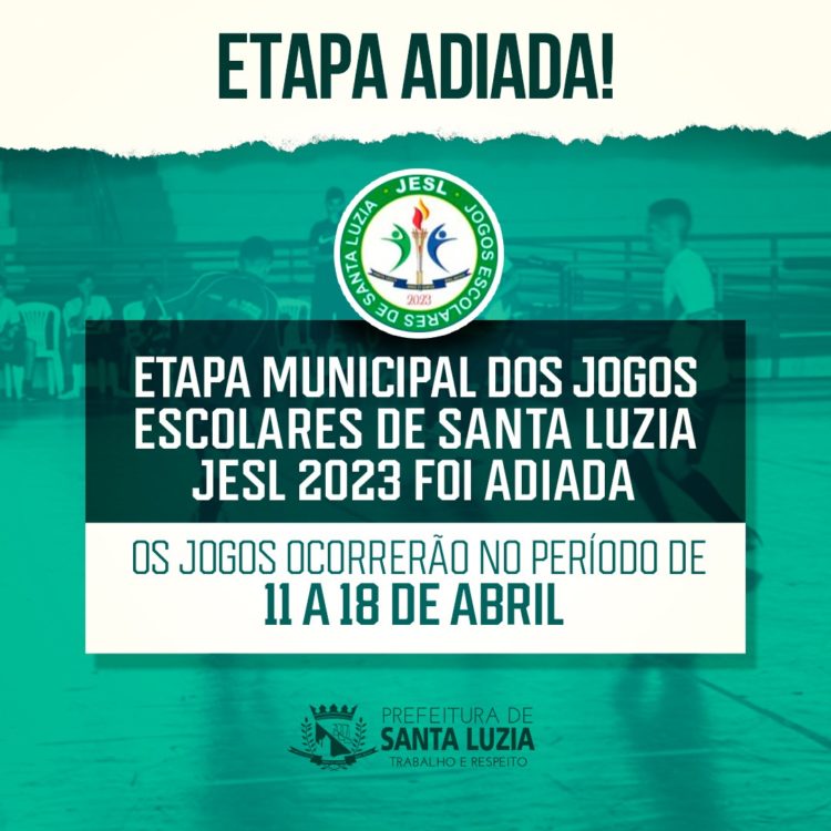 A prefeitura por meio da Secretaria Municipal de Esportes informa que a etapa Municipal dos Jogos Escolares de Santa Luzia – JESL 2023 foi adiada. Os jogos acontecerão no período de 11 a 18 de abril deste ano.