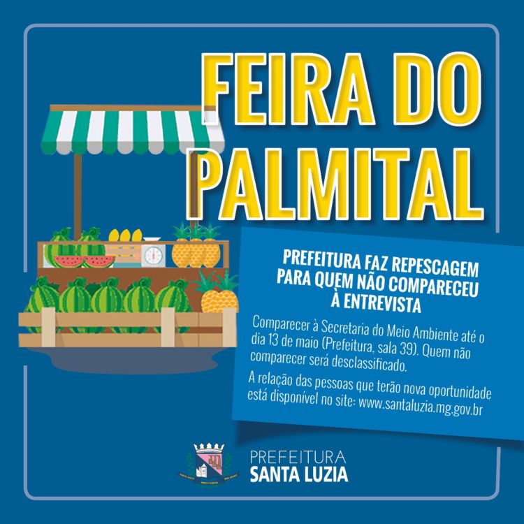 A Prefeitura de Santa Luzia, por meio da Secretaria Municipal de Meio Ambiente está promovendo uma repescagem para expositores inscritos no chamamento público da Feira do Palmital, aprovados na etapa preliminar, que não compareceram à entrevista.
