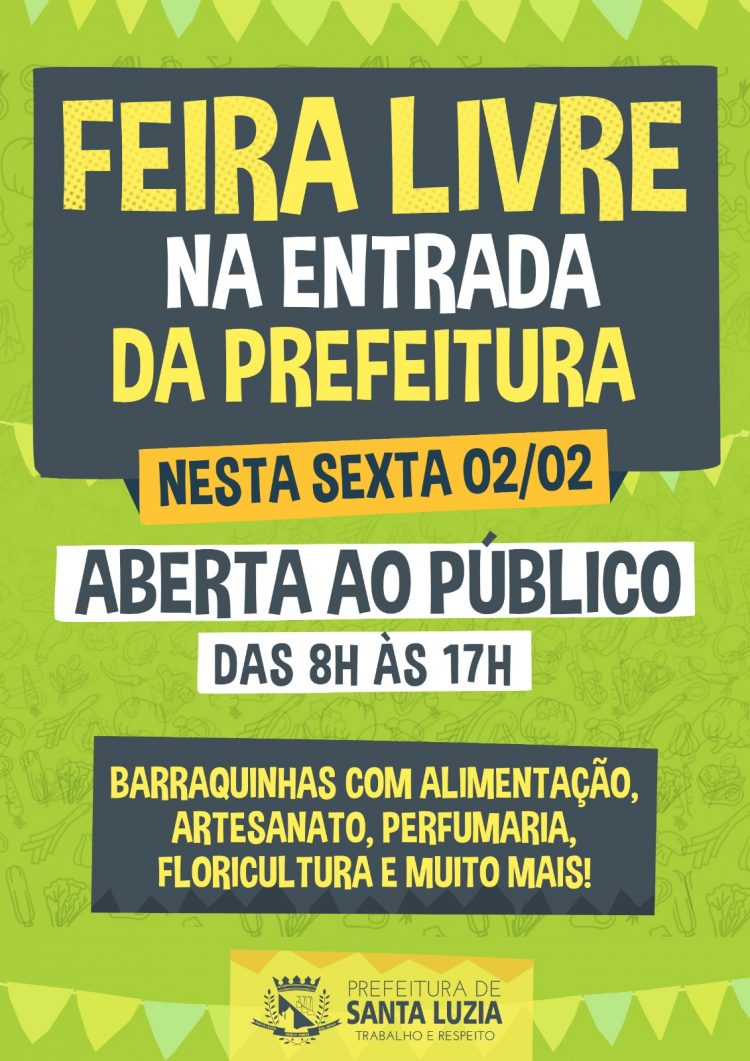 A primeira feira livre na Prefeitura de 2024 será nesta sexta (2), na entrada do centro administrativo municipal, das 8h às 17h. Serão comercializados produtos de artesanato, verduras, temperos, doces, tropeiro, macarrão à bolonhesa, pastel, caldo de cana, plantas, flores, peças íntimas, acessórios, chopp, sorvete, açaí, queijos, roscas, bolos, entre outros. A feira é aberta para o público em geral.