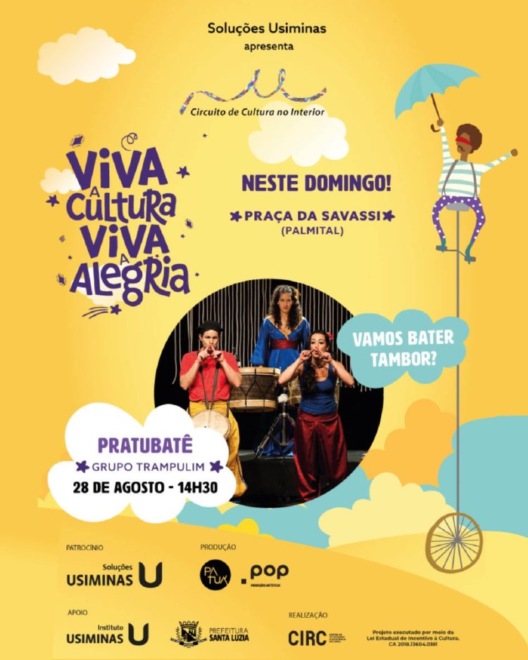 Neste domingo, a feirinha da pracinha da Savassi receberá a partir das 14h30, o Grupo Trampulim para o espetáculo cênico-musical “Pratubatê”. A apresentação marca o encerramento da temporada do Circuito de Cultura do Interior na cidade. O evento será aberto ao público gratuitamente e levará diversão e entretenimento para todo o público presente na feira. O projeto é patrocinado pela Soluções Usiminas, por meio da Lei Estadual de Incentivo à Cultura de Minas Gerais, com apoio do Instituto Usiminas e Prefeitura de Santa Luzia, e tem a realização do CIRC – Centro de Intercâmbio e Referência Cultural.