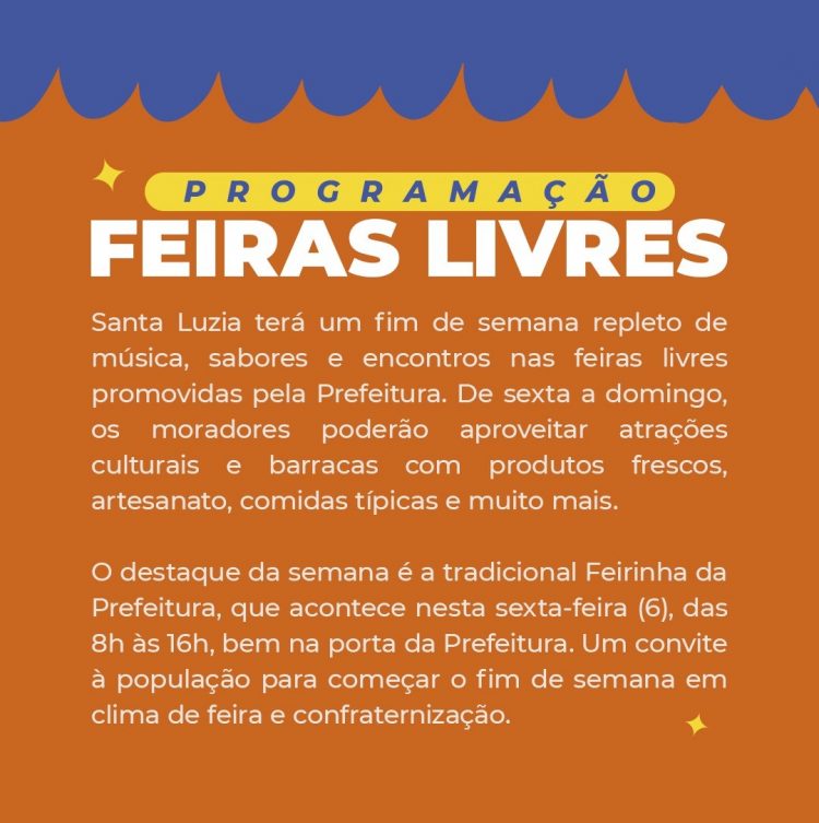 A Prefeitura convida toda a população a prestigiar as feiras, curtir as apresentações e apoiar os produtores e artistas locais. Traga a família, reencontre os amigos e aproveite esse circuito de cultura e lazer nos espaços públicos da nossa cidade!