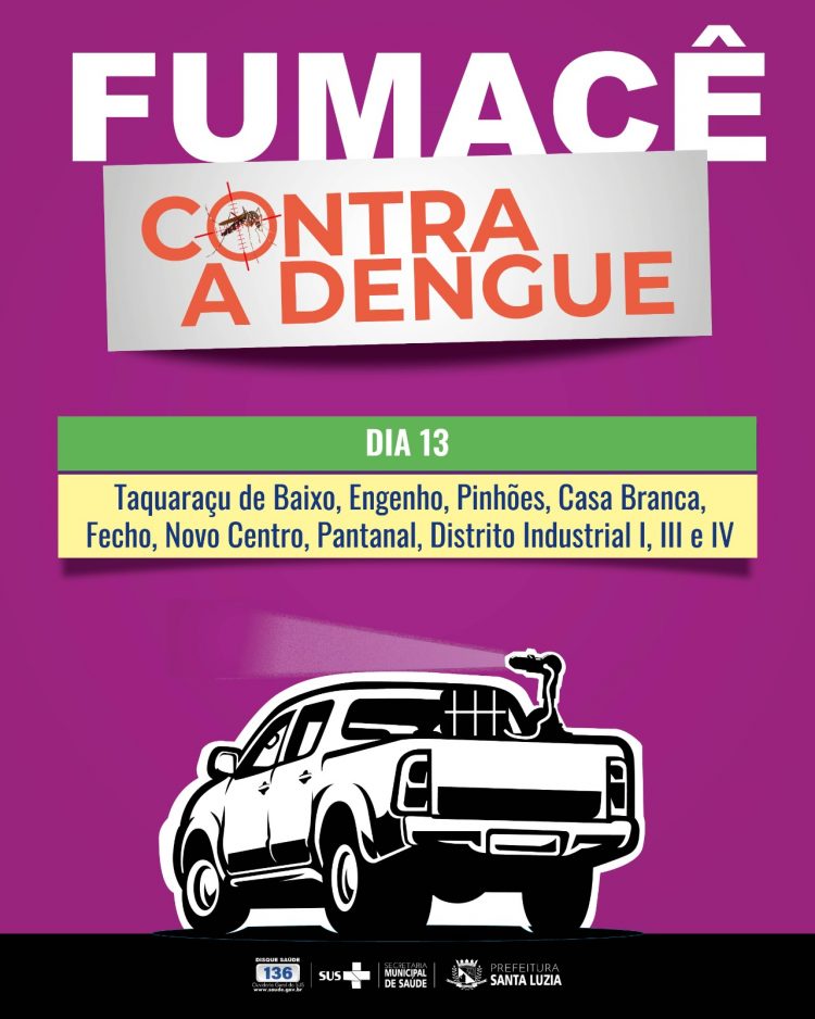 Seguindo o cronograma das ações de combate à dengue em todo o município, a picape do fumacê estará na segunda-feira (13), nas localidades: Taquaraçu de Baixo, Engenho, Pinhões, Casa Branca, Fecho, Novo Centro, Pantanal, Distrito Industrial I,III e IV.