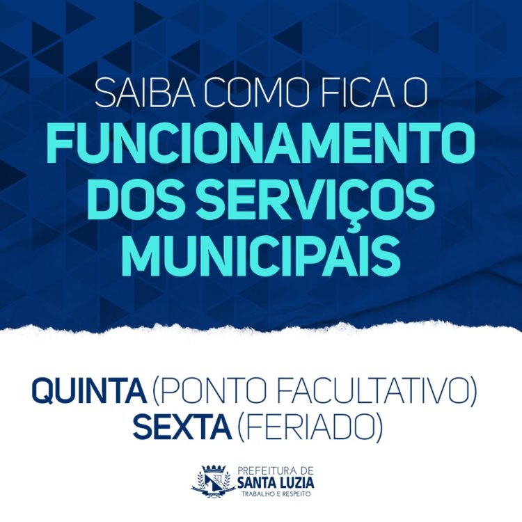 Na próxima sexta-feira (7), será feriado nacional da Paixão de Cristo. Na Prefeitura de Santa Luzia, não haverá expediente na quinta-feira, dia 6, que será ponto facultativo. Tendo em vista o feriado, haverá alterações no funcionamento de diversos serviços municipais. Fique atento e programe-se!