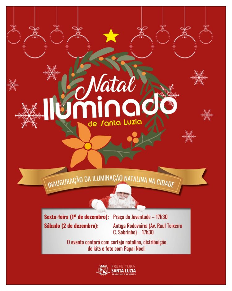 A Prefeitura de Santa Luzia irá inaugurar a iluminação de Natal da cidade na sexta-feira (1) e no sábado (2). As apresentações serão abertas ao público e contarão com atrações musicais, distribuição de kits natalinos para as crianças e cortejos por pontos iluminados.