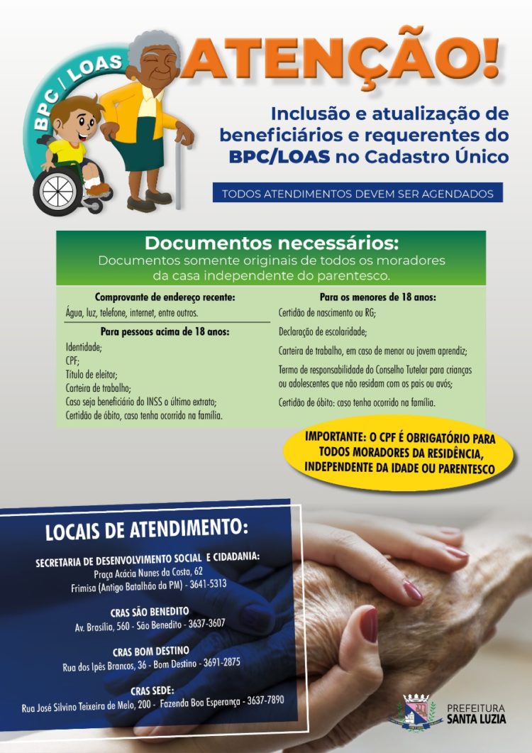 A prefeitura de Santa Luzia, por meio da Secretaria de Desenvolvimento Social e Cidadania está realizando a inclusão e atualização de beneficiários e requerentes do BPC/LOAS no Cadastro Único. Para a manutenção do BPC, é obrigatória a inscrição no Cadastro Único ou a atualização dos dados cadastrais. Caso a família não cumpra a obrigatoriedade da inscrição, o beneficiário terá o benefício suspenso pelo INSS.