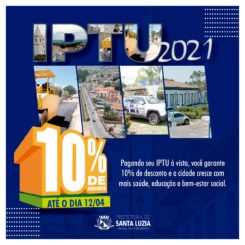 Pagando seu IPTU em dia, a cidade cresce com mais obras de infraestrutura urbana, saúde, educação e bem-estar social. Os contribuintes que desejarem pagar antecipadamente, já podem! Basta comparecer ao Setor de Tributos da Prefeitura e solicitar a sua guia ou a partir do dia 22 de fevereiro, através do site da Prefeitura, conforme descrição do link abaixo. Já as contestações em relação ao lançamento do tributo devem ser feitas até o dia 12 de abril, impreterivelmente. As guias de arrecadação impressas serão enviadas no endereço de correspondência dos contribuintes, através dos Correios e, para quem precisar da segunda via da guia de arrecadação do imposto poderá emiti-la pelo site da Prefeitura de Santa Luzia, a partir do dia 22 de fevereiro pelo link: bit.ly/3sab0w8