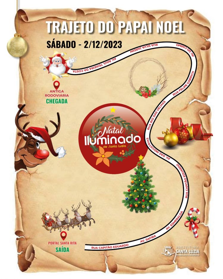 A partir das 17 horas, a carreta com o Papai Noel sairá do Portal Santa Rita e seguirá pela Rua Capitão Eduardo, Av. Safira, Av. Esmeralda, Rua Capitão Eduardo, Av. das Indústrias, Rua Rio das Velhas, Rua Felipe Gabrich, Ponte Nova, Av. do Carmo, Rua Silva Jardim, Av. Raul Teixeira da Costa e a chegada será na Antiga Rodoviária.