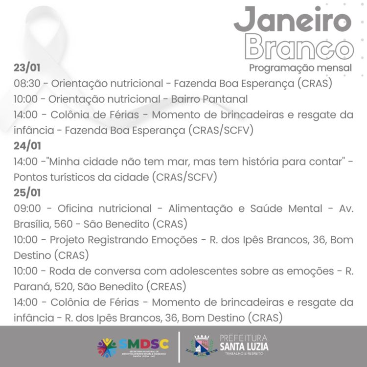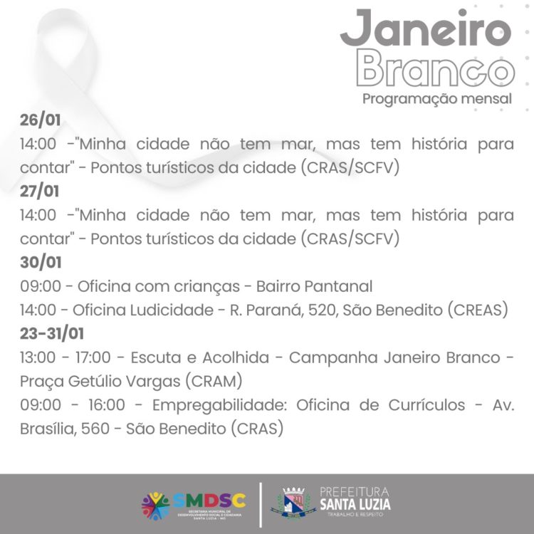 A Prefeitura de Santa Luzia, através da Secretaria Municipal de Desenvolvimento Social e Cidadania (SMDSC), divulga as ações que ocorrerão nos próximos dias de janeiro, fechando a campanha de conscientização e cuidado com a saúde mental: “Janeiro Branco”, nos equipamentos da Assistência Social.
