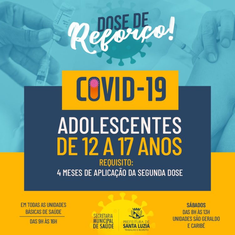 A Prefeitura de Santa Luzia informa que a partir desta segunda-feira (30), está liberada a dose de reforço da vacina contra a covid-19 para adolescentes com idade entre 12 e 17 anos. A vacina poderá ser administrada em pessoas que já tenham completado 4 meses desde a aplicação da segunda dose.