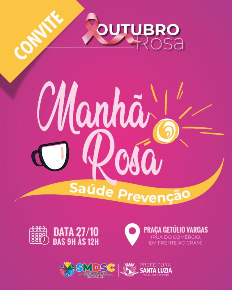 A Prefeitura de Santa Luzia através da Secretaria de Desenvolvimento Social e Cidadania, como ação de finalização do Outubro Rosa, irá realizar a Manhã Rosa.Trata-se de uma ação itinerante, que ofertará várias atividades para levar à população informações sobre a importância da prevenção e diagnóstico do câncer de mama e de colo do útero. A ação acontecerá na Praça Getulio Vargas – Bairro São João Batista, dia 27 de outubro, das 9h às 12h.