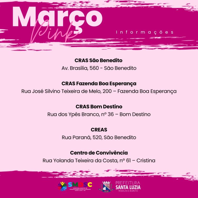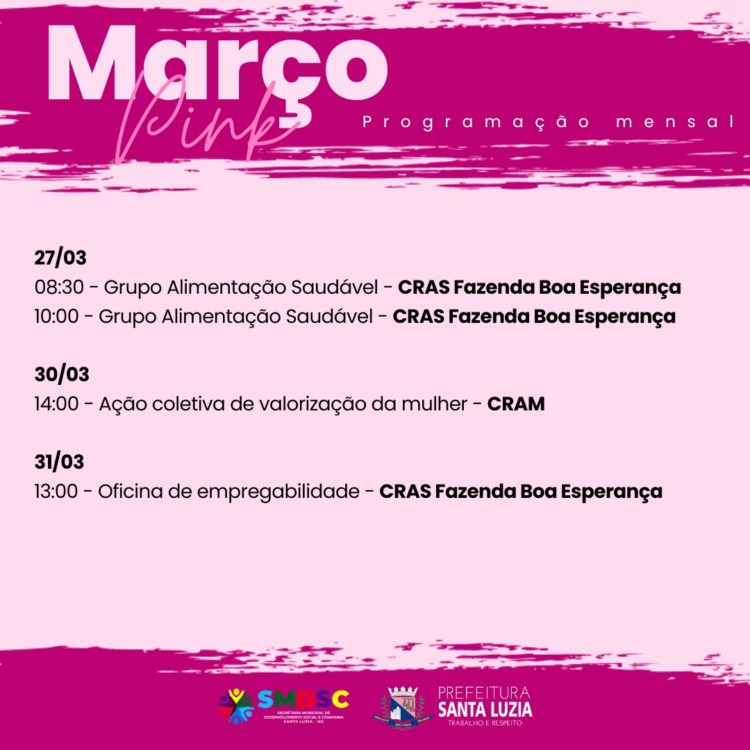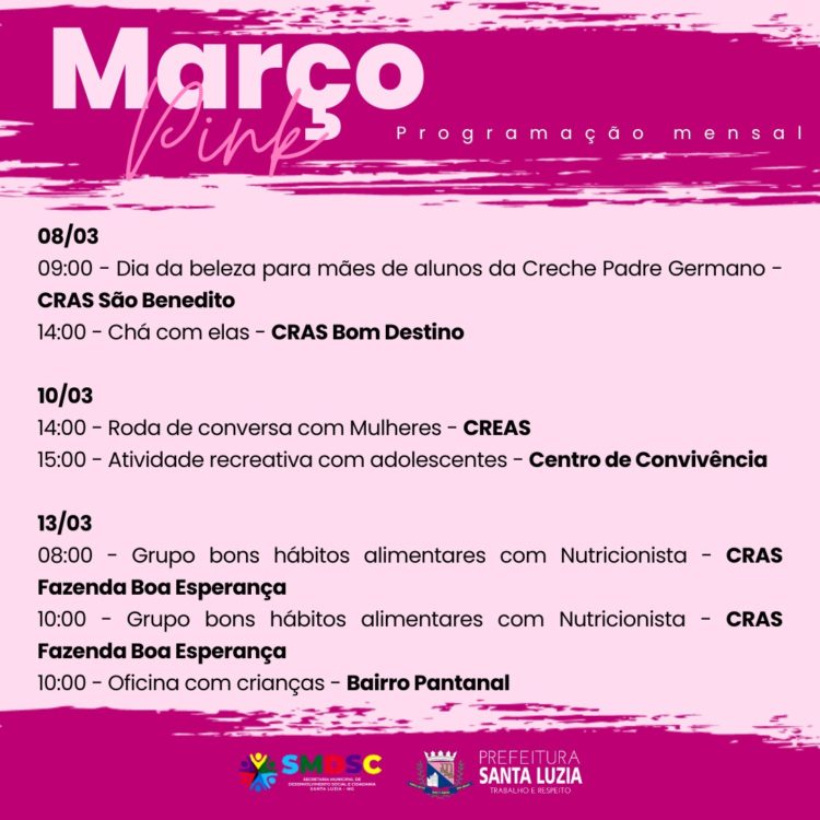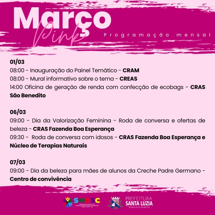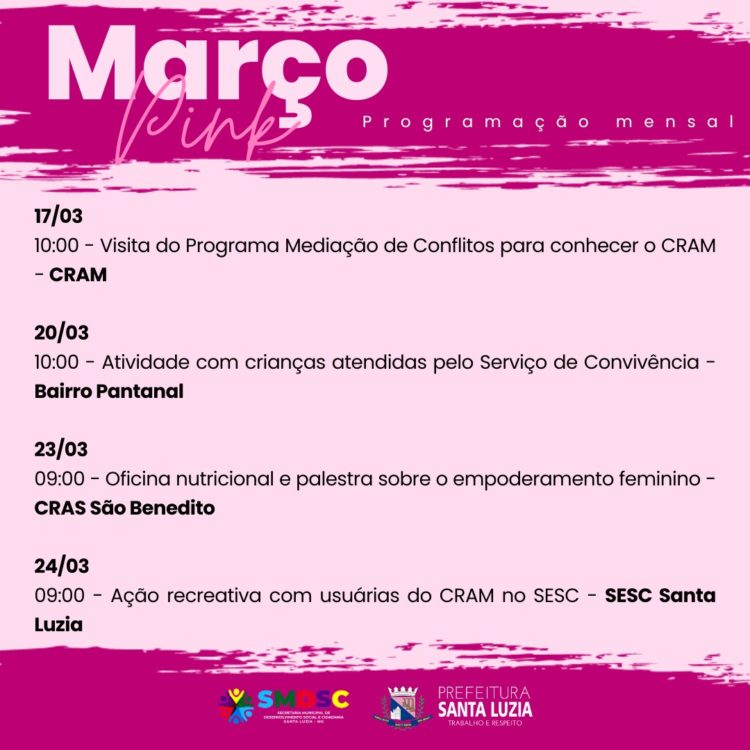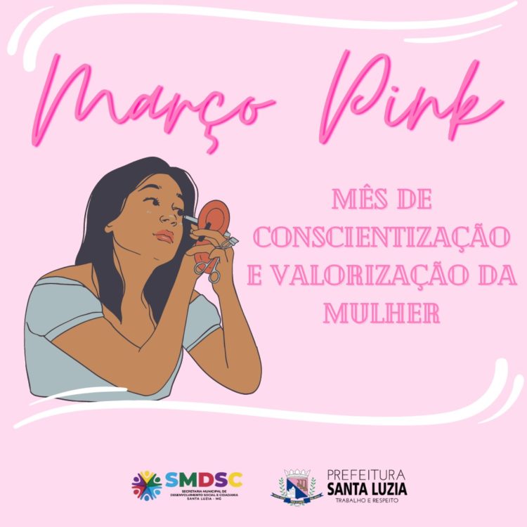 A Prefeitura de Santa Luzia, por meio da Secretaria de Desenvolvimento Social e Cidadania, divulga o calendário de ações deste mês sob o tema: “Março Pink – Mês de Conscientização e Valorização da Mulher”, com atividades previstas em todos os equipamentos da Assistência Social.