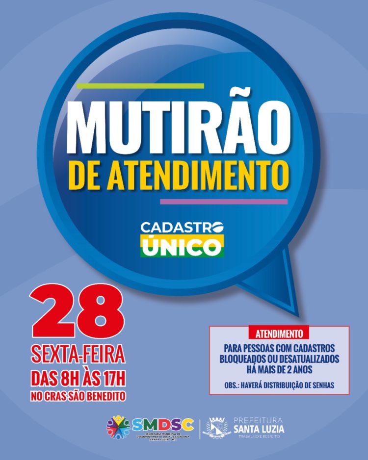 Nesta sexta (28), a Prefeitura de Santa Luzia através da Secretaria de Desenvolvimento Social e Cidadania, irá realizar um Mutirão de Atendimento do Cadastro Único no CRAS SÃO BENEDITO.