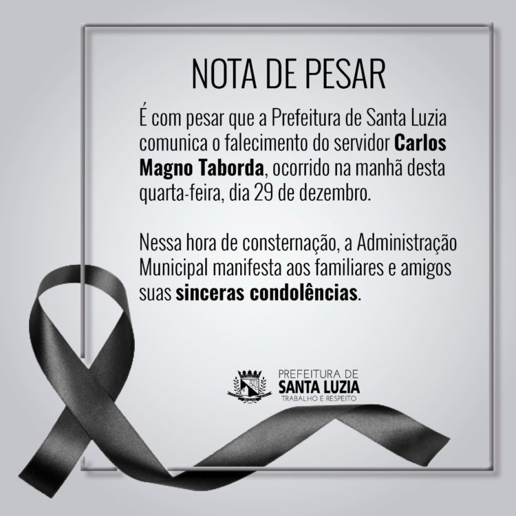 É com pesar que a Prefeitura de Santa Luzia comunica o falecimento do servidor Carlos Magno Taborda, ocorrido na manhã desta quarta-feira, dia 29 de dezembro. Nessa hora de consternação, a Administração Municipal manifesta aos familiares e amigos suas sinceras condolências.