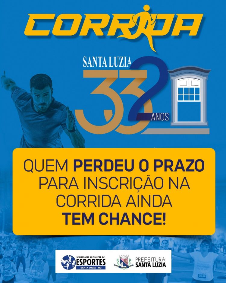 A Prefeitura de Santa Luzia, por meio da Secretaria Municipal de Esportes e Lazer, anuncia uma nova oportunidade para aqueles que perderam o prazo de inscrição ou tiveram suas inscrições indeferidas para a corrida em celebração aos 332 anos da cidade.