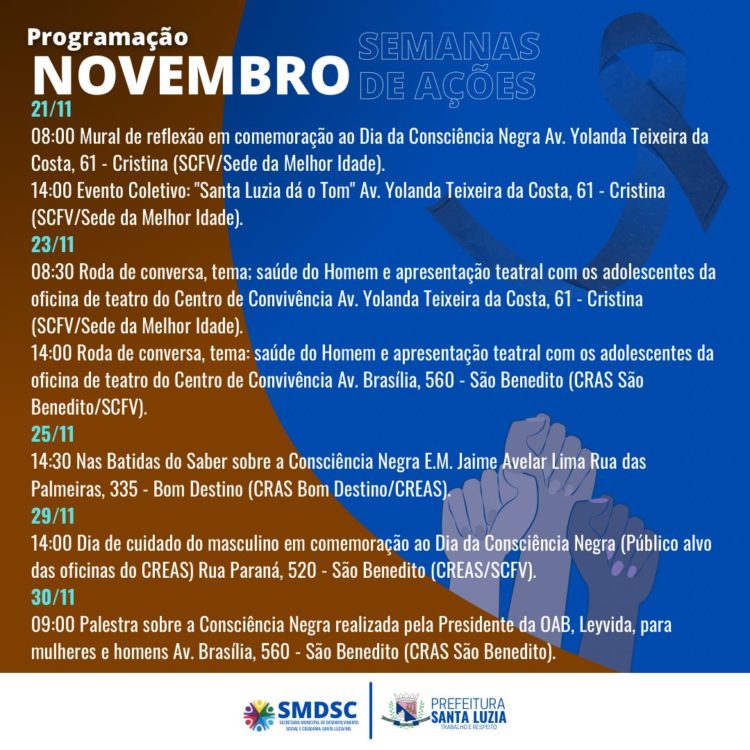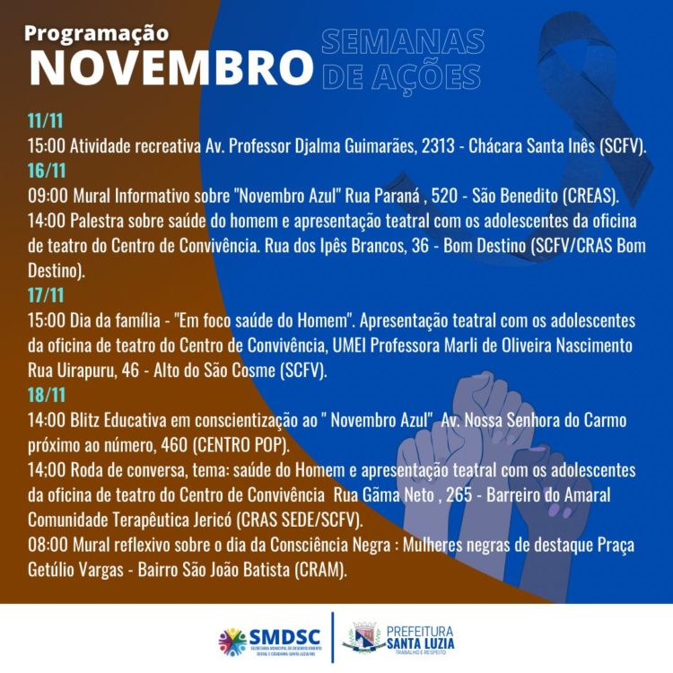 Novembro já começou e com ele iniciaram várias ações dentro dos equipamentos da assistência social. Neste sentido a Prefeitura de Santa Luzia, por meio da Secretaria de Desenvolvimento Social e Cidadania, durante todo o mês vai realizar atividades para levar à população informações sobre campanhas como o Novembro Azul e o Dia da Consciência Negra.
