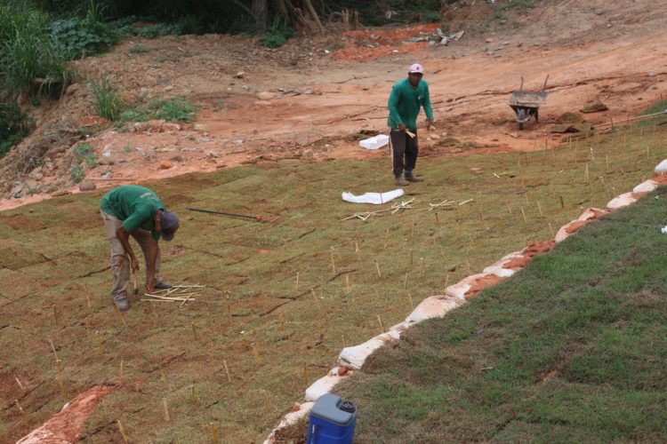 A Prefeitura de Santa Luzia, por meio da Secretaria Municipal de Obras, está finalizando a obra de contenção para reforço da estrutura da cabeceira da ponte da Avenida Brasília, que fica entre os bairros Monte Carlo e Duquesa II. Com o muro de gabião pronto, agora os trabalhadores se concentram em alguns reparos e efetuam o plantio de grama no local.