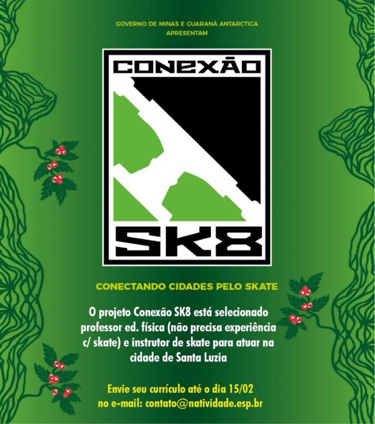 O projeto Conexão Sk 8 está selecionando professor de educação física (não precisa ter experiência com skate) e instrutor de skate, para atuarem na cidade. Interessados devem enviar currículo para o e-mail contato@natividade.esp.br. O projeto tem o apoio da Prefeitura de Santa Luzia e levará aulas de skate para duas escolas da cidade. A assinatura do convênio de parceria aconteceu no mês de janeiro.