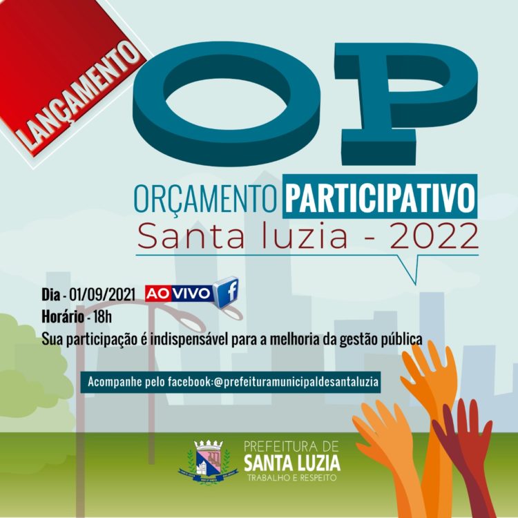 O Orçamento Participativo 2022 será lançado na quarta-feira (1), com a participação do prefeito delegado Christiano Xavier e equipe da secretaria municipal de Finanças. O evento terá transmissão ao vivo a partir das 18h, pelo facebook da Prefeitura de Santa Luzia: @prefeituramunicipaldesantaluzia. No mesmo dia, será disponibilizado, o formulário para a votação popular, através do qual, cidadãos de Santa Luzia poderão eleger os assuntos de interesse público que devem receber investimentos da administração municipal. A votação poderá ser nas áreas de educação, saúde, desenvolvimento social, cultura, esporte e obras. A participação popular é indispensável para a melhoria da gestão pública. Acompanhe!