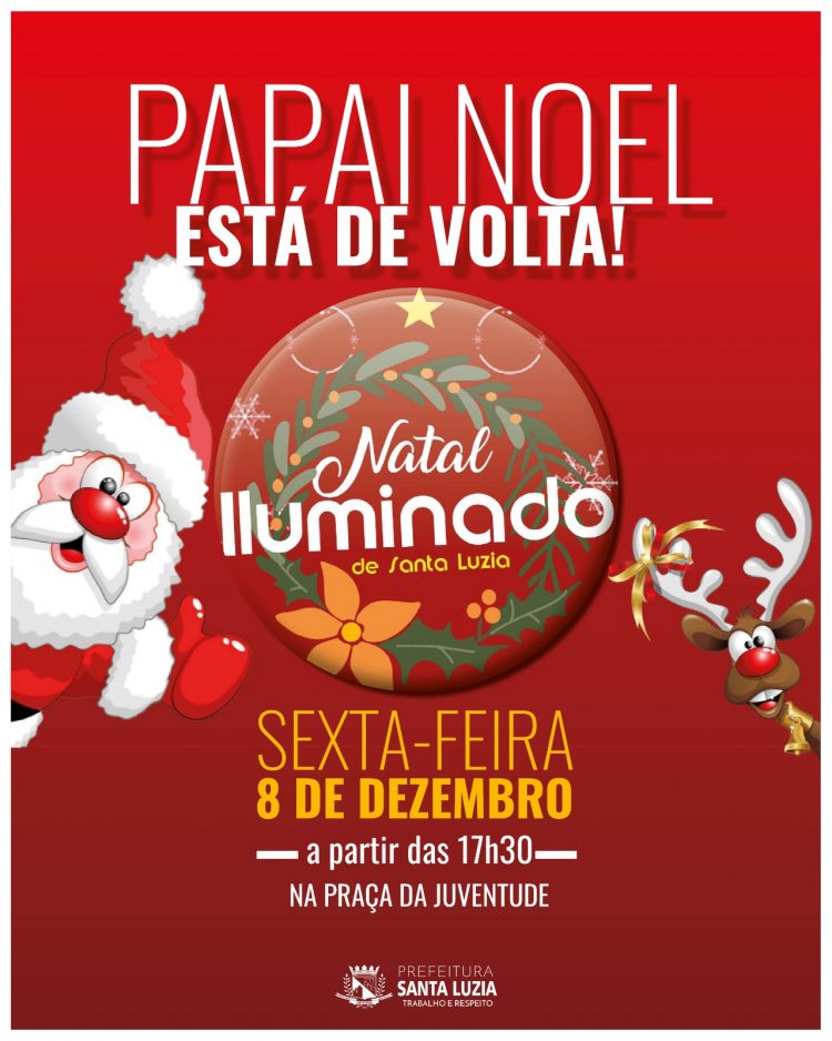 O Papai Noel estará de volta à Praça da Juventude, no bairro Cristina, na próxima sexta-feira (8), a partir das 17h30 e ficará disponível para tirar fotos com a criançada. A ação faz parte do Natal Iluminado 2023, promovido pela Prefeitura de Santa Luzia. No local também haverá a apresentação do Grupo Minueto em Harmonia.