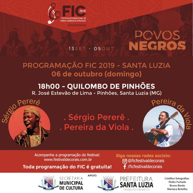 Neste domingo (6), a partir das 18h, a comunidade de Pinhões receberá o show dos músicos Sérgio Pererê e Pereira da Silva, como parte do Festival Internacional de Corais 2019, um projeto que iniciou em 2004, com a realização do maestro Lindomar Gomes e que tem por finalidade proporcionar o intercâmbio cultural, a difusão, a integração, o incentivo, o desenvolvimento e o fortalecimento de laços entre corais, bandas e congados regionais, nacionais e internacionais e o público. O evento tem a parceria da Prefeitura de Santa Luzia, por meio da Secretaria Municipal de Cultura e Turismo.