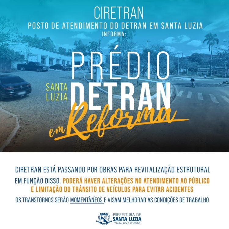 O Ciretran, posto de atendimento do Detran em Santa Luzia, informa que está passando por obras para revitalização estrutural. Em função disso, poderá haver alterações no atendimento ao público, com a diminuição da capacidade de espaço e emissão de documentos. Também foi feito o isolamento da área externa, limitando o trânsito de veículos para evitar acidentes.