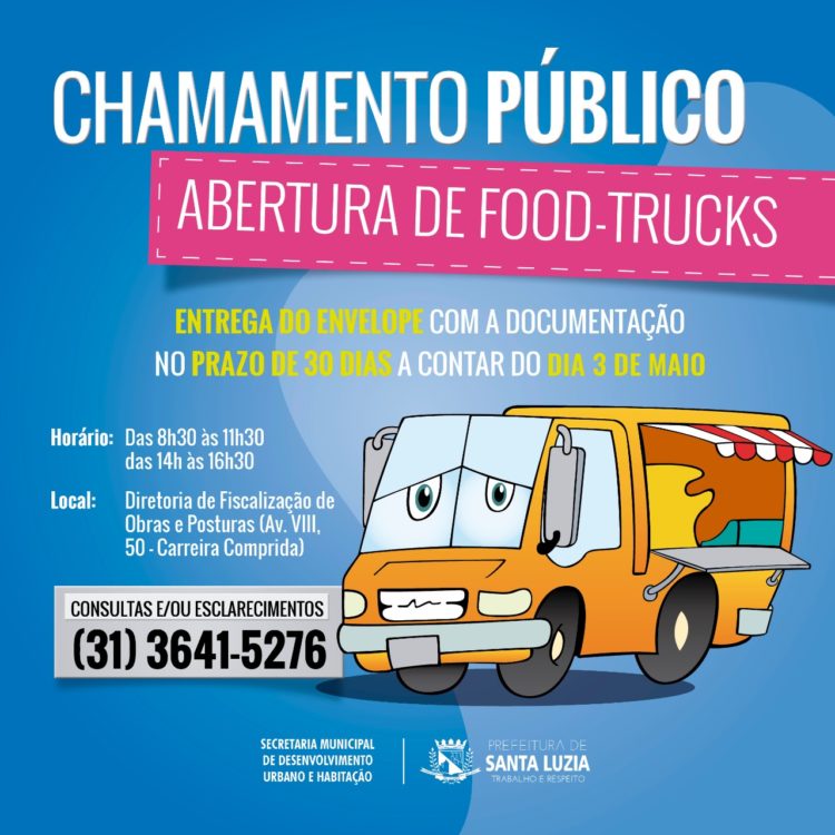 A Prefeitura de Santa Luzia, através da secretaria municipal de Desenvolvimento Urbano e Habitação, acaba de abrir chamamento público para a concessão de Permissão de Uso de 63 espaços, destinados à alimentação humana, na modalidade conhecida por food-truck, nas vias e logradouros públicos do município. O edital do chamamento (nº 001/2021) foi publicado no DOM – Diário Oficial do Município na terça-feira (3) e pode ser acessado através do link para o DOM: bit.ly/3eRA0Dw ou diretamente no site da secretaria: bit.ly/3uhm1gQ