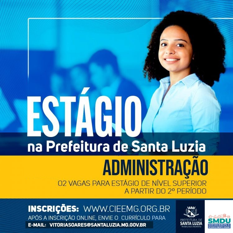 A Prefeitura de Santa Luzia, por meio da Secretaria Municipal de Desenvolvimento Urbano informa a abertura de duas vagas para estágio na área de administração, destinadas a estudantes a partir do 2º período da faculdade. A carga horária semanal é de 30 horas (6 horas por dia), com atribuições que incluem atendimento ao público, auxílio nos processos administrativos e arquivamento de documentos. O local de trabalho será na sede da Secretaria, situada nas dependências da Prefeitura, no bairro Carreira Comprida.