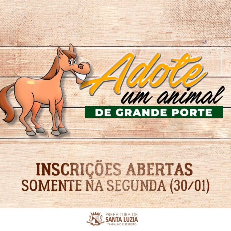 Estarão abertas na segunda-feira próxima, dia 30, de 0h às 23h59, as inscrições para a adoção de cinco equinos disponibilizados para doação pela Prefeitura de Santa Luzia. Estarão disponíveis 2 cavalos, 2 éguas e 1 potro. Todos estão em boas condições de saúde e dispõem de laudo médico veterinário. Os animais adotados não poderão ser submetidos a qualquer tipo de trabalho, especialmente o de tração (carroça, charrete ou arado) e tampouco poderão ser usados em competições esportivas, como salto ou corrida.