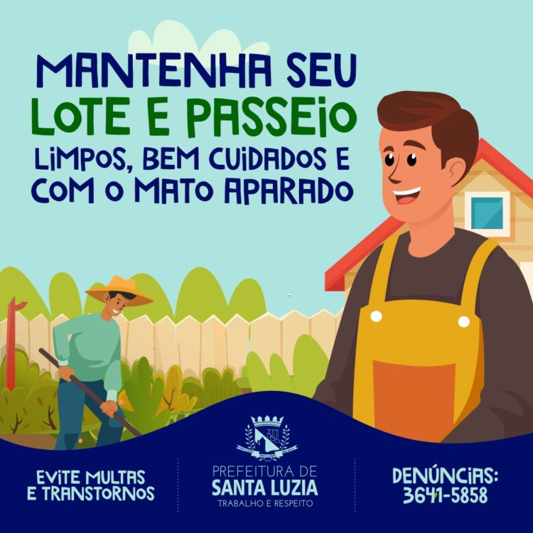 Em decorrência do período chuvoso e risco de proliferação de doenças, animais peçonhentos, pragas domésticas e mosquito Aedes Aegypti, a Prefeitura de Santa Luzia orienta os proprietários de lotes particulares quanto aos cuidados que devem ser tomados com seus imóveis para evitar possíveis transtornos. Os donos de imóveis precisam manter os terrenos e passeios limpos, bem cuidados e com o mato aparado. Além de ser um dever do proprietário do espaço, estas ações contribuem com a saúde de toda a população e ajudam manter a organização e limpeza da cidade.