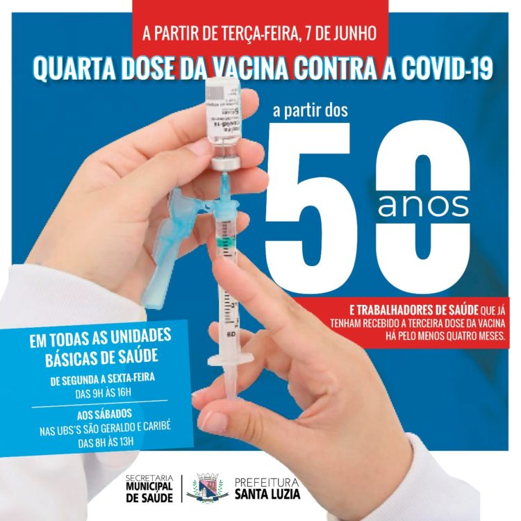 A partir desta terça-feira (7) a Prefeitura de Santa Luzia iniciará a aplicação da quarta dose da vacina contra a covid-19 em pessoas com idade a partir dos 50 anos e trabalhadores de saúde que já tenham recebido a terceira dose da vacina há pelo menos quatro meses. Os imunizantes estão disponíveis em todas as unidades básicas de saúde, de segunda a sexta-feira, das 9h às 16h e aos sábados nas UBS’s São Geraldo e Caribé, das 8h às 13h.