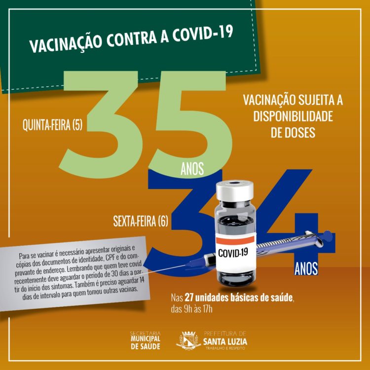 A Prefeitura de Santa Luzia amplia mais uma vez a faixa etária para vacinação contra a covid-19. Nesta quinta-feira (5), poderão receber a primeira dose do imunizante pessoas com idade a partir dos 35 anos e na sexta-feira (6), poderão receber a vacina pessoas com 34 anos de idade ou mais. A vacina estará disponível em todas as unidades de saúde do município, das 9h às 17h e depende da disponibilidade de doses.