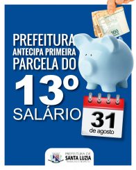 A Prefeitura de Santa Luzia irá antecipar o pagamento da 1ª parcela do 13º salário dos servidores municipais. O valor será creditado nesta quinta-feira (31), junto com o pagamento referente ao mês de agosto. Com os valores injetados na economia, a expectativa é fomentar o comércio local. A segunda parcela será quitada no mês de dezembro.