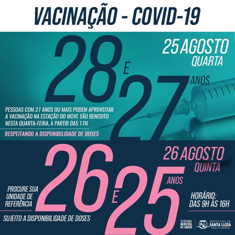 A Prefeitura de Santa Luzia amplia a vacinação contra a covid-19 nesta semana para a população com idade a partir dos 25 anos. Amanhã, quarta-feira (25), poderão receber a primeira dose da vacina pessoas com 27 e 28 anos ou mais. Já na quinta-feira (26), será a vez de pessoas com 25 e 26 anos ou mais. A vacinação acontecerá em todas as 27 unidades básicas de saúde do município, das 9h às 16h e depende da disponibilidade de doses.