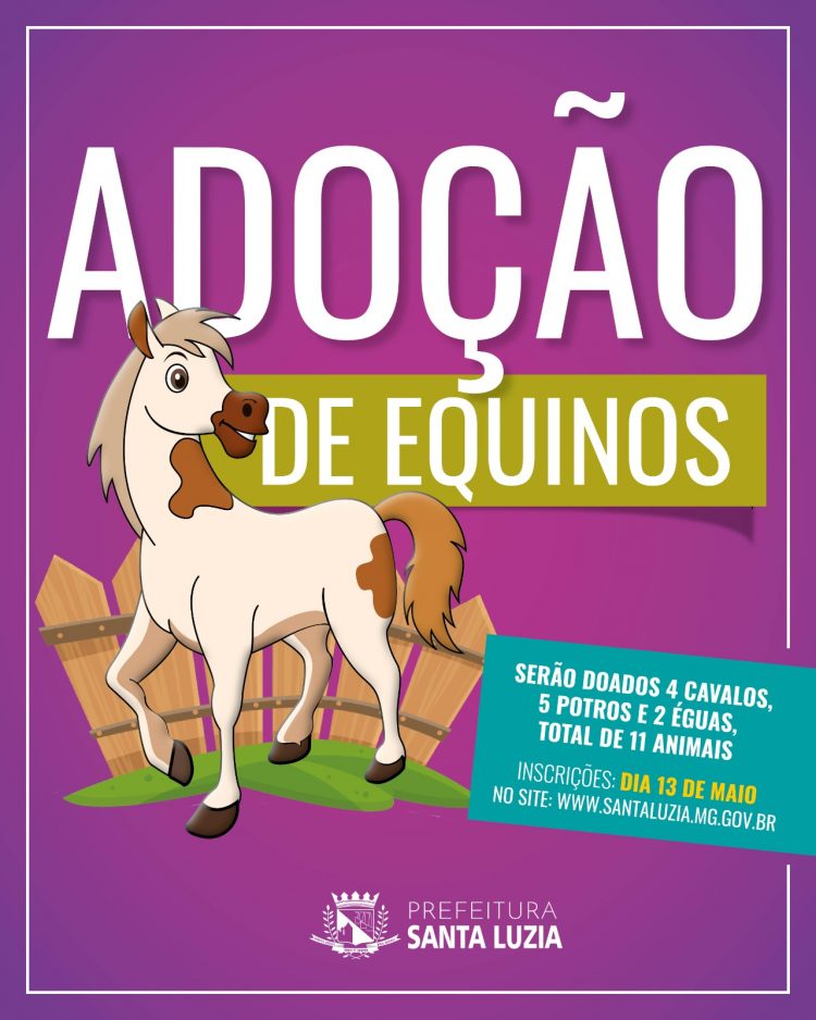 Serão abertas às 0h00 da próxima segunda-feira, dia 13, as inscrições para interessados na adoção de 11 equinos, sendo 4 cavalos, 2 éguas e 5 potros, que estão sendo doados pela Prefeitura de Santa Luzia. As inscrições, que se encerram no mesmo dia, poderão ser feitas das 00h00 às 23h59 da segunda-feira, através do endereço eletrônico https://bit.ly/3UUPooL