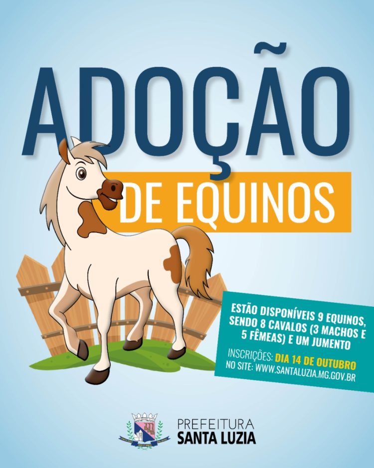Serão abertas na próxima sexta-feira, dia 14, as inscrições para interessados na adoção de 9 equinos, sendo 8 cavalos (3 machos e 5 fêmeas) e um jumento, que estão sendo doados pela Prefeitura de Santa Luzia. As inscrições, que se encerram no mesmo dia, poderão ser feitas das 00h00 às 23h59 da sexta-feira, 14 de outubro, através do endereço eletrônico https://bit.ly/3V1q12L.