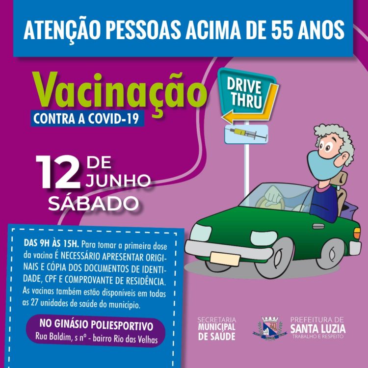 A Prefeitura de Santa Luzia anuncia nesta sexta-feira (11), a ampliação da vacinação contra a covid-19 para pessoas com idade a partir de 55 anos. Para otimizar a campanha, neste sábado (12) será montado um drive-thru no Ginásio Poliesportivo (rua Baldim, s/n, bairro Rio das Velhas), das 9h às 15h, exclusivamente para este público.