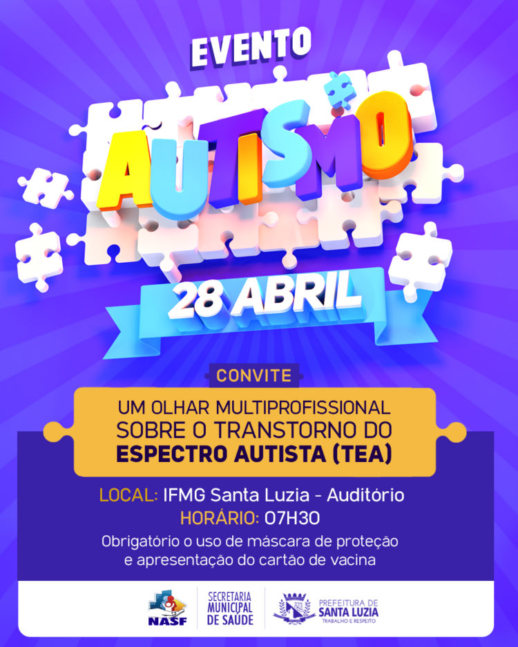 A Prefeitura de Santa Luzia, por meio da Secretaria Municipal de Saúde convida toda a população para o evento “Um olhar multiprofissional sobre o Transtorno do Espectro Autista (TEA)”.