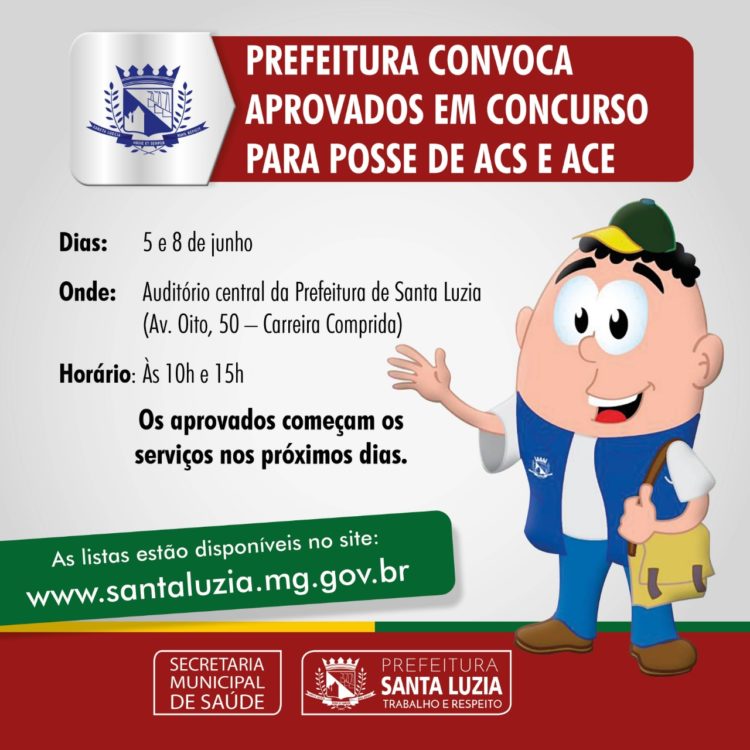 Nos dias 5 e 8 de junho, a Prefeitura de Santa Luzia dará posse aos candidatos aprovados no concurso público para os cargos de agente comunitário de saúde e agente de combate a endemias. Serão 52 ACS’s e 31 ACE’s empossados em escalas na sexta e segunda-feira próximos, às 10h e 15h. Isso, para evitar aglomerações.