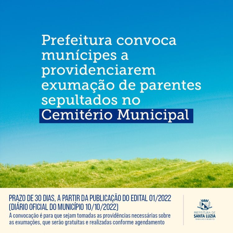 A convocação é para que sejam tomadas as providências necessárias sobre as exumações, que serão gratuitas e realizadas conforme agendamento prévio. Não havendo comparecimento do responsável no prazo mencionado acima, os restos mortais serão depositados no ossário comunitário sem separação por falecido com base no Art. 230 do Código de Posturas do Município de Santa Luzia – Lei 1545/92, de 28 de setembro de 1992, cumulado com o Art. 12, Inciso lV do Decreto 1971/2007.