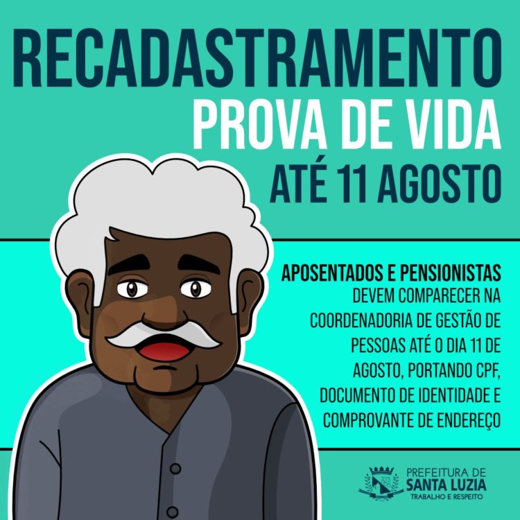 A Prefeitura de Santa Luzia convoca os servidores aposentados e pensionistas a comparecerem na Coordenadoria de Gestão de Pessoas, portando CPF, RG e comprovante de endereço, para realizarem o devido recadastramento (prova de vida). Anualmente a administração municipal realiza a prova de vida dos servidores aposentados e pensionistas, mas no ano de 2020 em decorrência do início da pandemia do novo Coronavírus não foi possível realizar o procedimento.