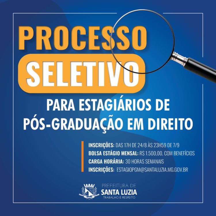 Foi publicado pela Prefeitura por meio da PGM – Procuradoria-Geral do Município de Santa Luzia, nesta quarta-feira, o Edital 01, de 24 de agosto de 2022, o qual estabelece a abertura de Processo Seletivo Simplificado para o preenchimento de quatro vagas (sendo uma para pessoa com deficiência), mais Cadastro de Reserva, para estagiários de nível superior em Direito que estejam matriculados em curso de pós-graduação na área de Direito. O valor da bolsa de estágio mensal é de R$ 1.500,00, com benefícios, e a carga horária é de 30 horas semanais.