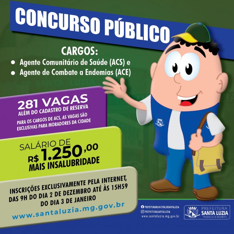 A Prefeitura de Santa Luzia anunciou, na manhã desta segunda-feira (7), a publicação do edital do Concurso Público para os cargos de Agente Comunitário de Saúde (ACS) e Agente Combate a Endemias (ACE). Ao todo, são 281 vagas, além do cadastro de reserva.