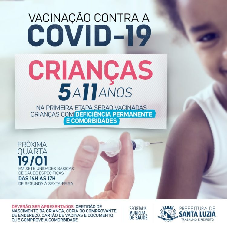 A Prefeitura de Santa Luzia anuncia para a próxima quarta-feira (19) o inicio da vacinação contra a covid-19 para as crianças de 5 a 11 anos de idade. Nesta primeira etapa serão vacinadas crianças com deficiência permanente e comorbidades (deverão ser apresentados documentos comprobatórios).