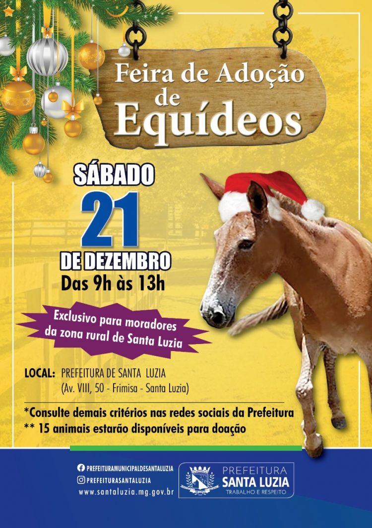 A Prefeitura de Santa Luzia, através do Departamento de Controle de Zoonoses da secretaria da Saúde, promoverá no sábado (21), feira de adoção de 15 equídeos que foram retirados das ruas ou encontravam-se em situação irregular ou de maus tratos. Dentre os animais a serem doados há cavalos, burros e mulas, entre machos e fêmeas de diversas idades. O objetivo principal da ação é transferir esses animais da zona urbana para a zona rural do município.