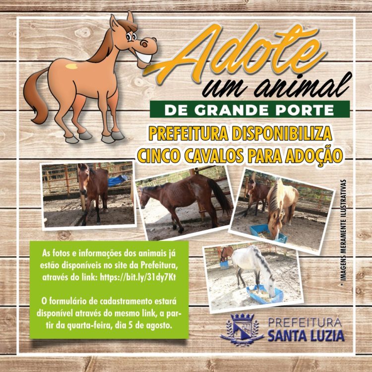 Cinco cavalos, sendo três machos e duas fêmeas, todos adultos, serão disponibilizados para adoção pela Prefeitura de Santa Luzia na primeira quinzena de agosto. Os animais foram recolhidos por terem sido encontrados abandonados em via pública, estiveram guardados nas instalações da Prefeitura pelo prazo mínimo exigido por lei (7 dias úteis) sem que fossem reclamados e foram oferecidos com prioridade a escolas de veterinária, dentre outras instituições. Não tendo havido interesse, serão abertas inscrições para interessados na adoção.