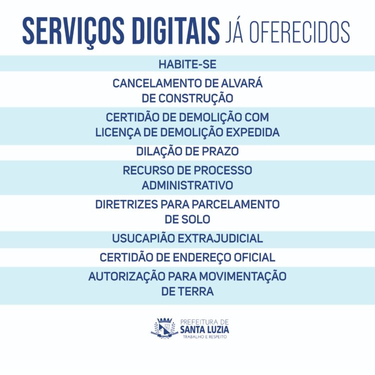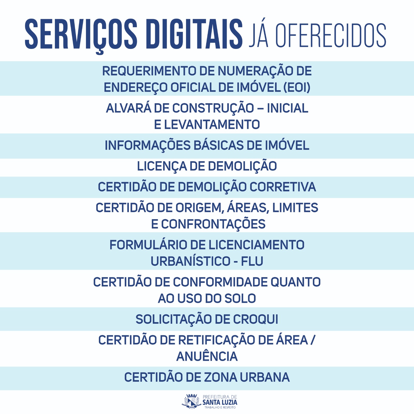 A Prefeitura de Santa Luzia tem investido em tecnologia para facilitar a vida dos cidadãos que precisam acessar os serviços oferecidos pela administração municipal. Recentemente, foram disponibilizados mais dois novos serviços digitais: o Desarquivo de Processos Físicos, que consiste no desarquivamento de processos para a realização de vistas e fotocópias, e a Modificação de Planta Aprovada Processo, a qual o solicitante poderá solicitar a modificação de projeto arquitetônico já aprovado. Esses serviços são de responsabilidade da Secretaria Municipal de Desenvolvimento Urbano.