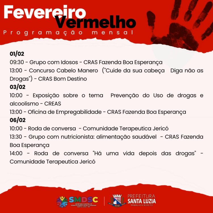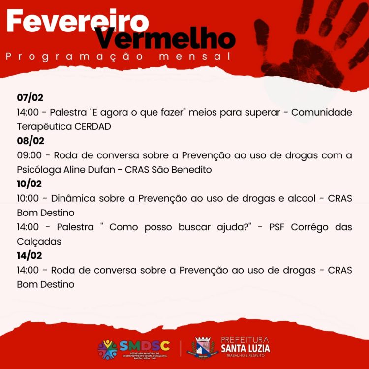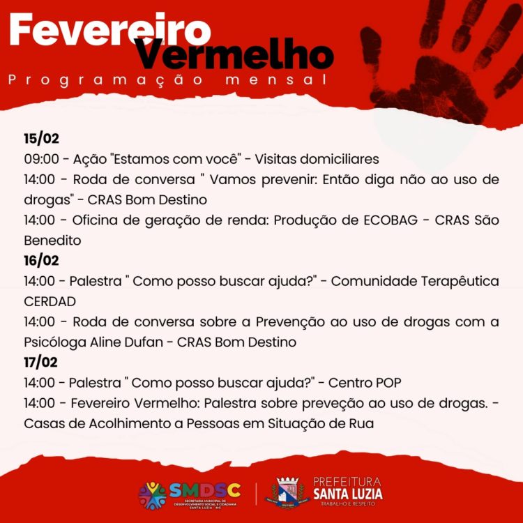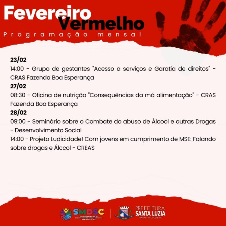 A Prefeitura de Santa Luzia, por meio da Secretaria de Desenvolvimento Social e Cidadania divulga nesta terça-feira (1), a abertura da campanha “Fevereiro Vermelho”, com atividades previstas em todos os equipamentos da Assistência Social. Dia 20 de fevereiro, é a data que marca o Dia Nacional de Combate às Drogas e ao Alcoolismo. Com essa proposta, as ações têm como objetivo dar atenção especial a esse tema tão importante, dando ênfase à prevenção, alertando e conscientizando a população sobre os malefícios decorrentes do uso e abuso de álcool e outras drogas.