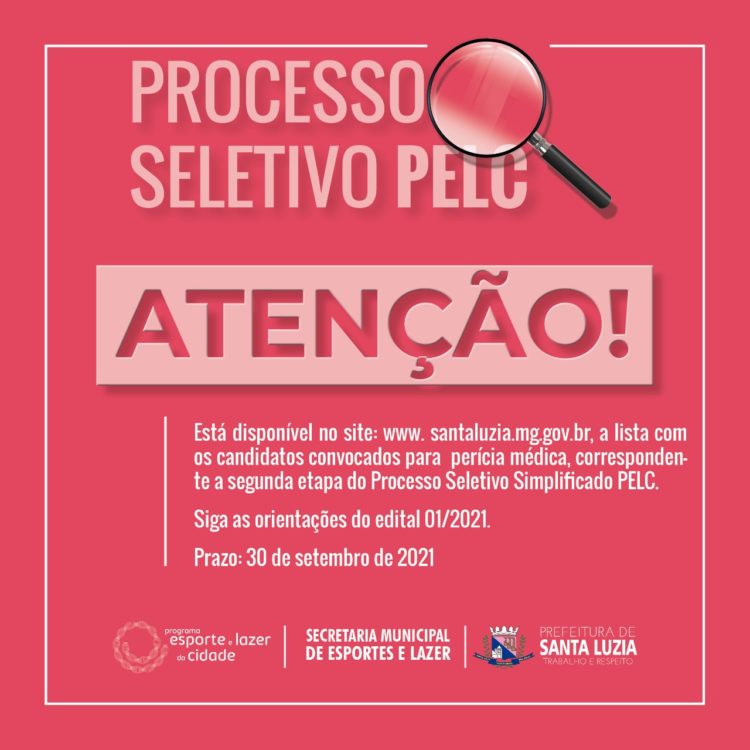 Já está disponível no site da Prefeitura de Santa Luzia a classificação do Processo Seletivo do Pelc – Programa Esporte e Lazer da Cidade. Agora, os candidatos estão sendo convocados para perícia médica e têm até o dia 30 de setembro para cumprir essa segunda etapa.